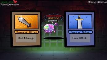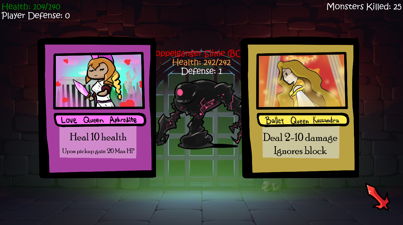 Monsters threaten the safety of the kingdom! Gather the Sword Queens to save the day! Choose from two cards drawn from the deck at a time and choose between two new Sword Queens every time you kill an enemy, but be careful! You can't see what the enemy will do!